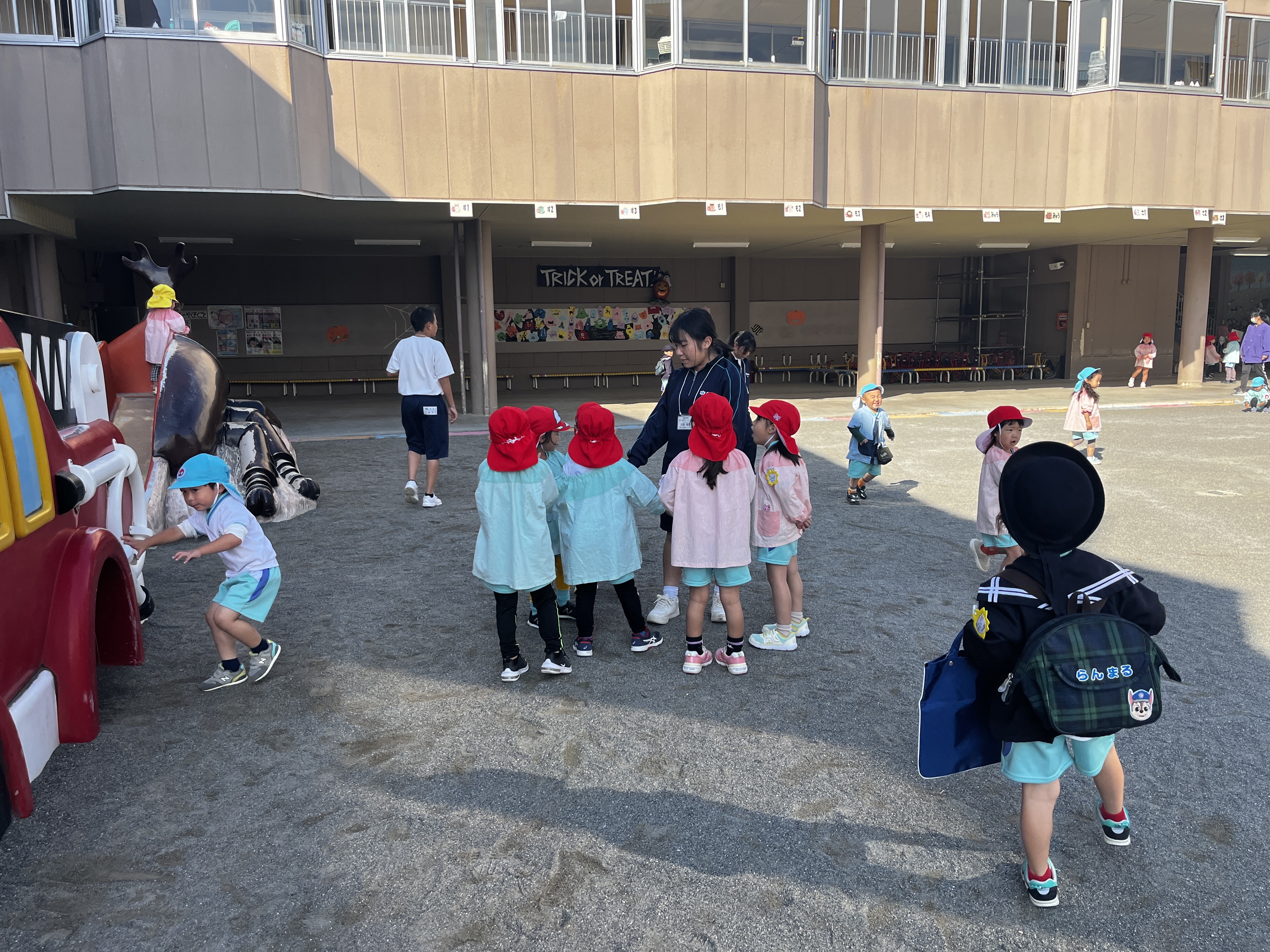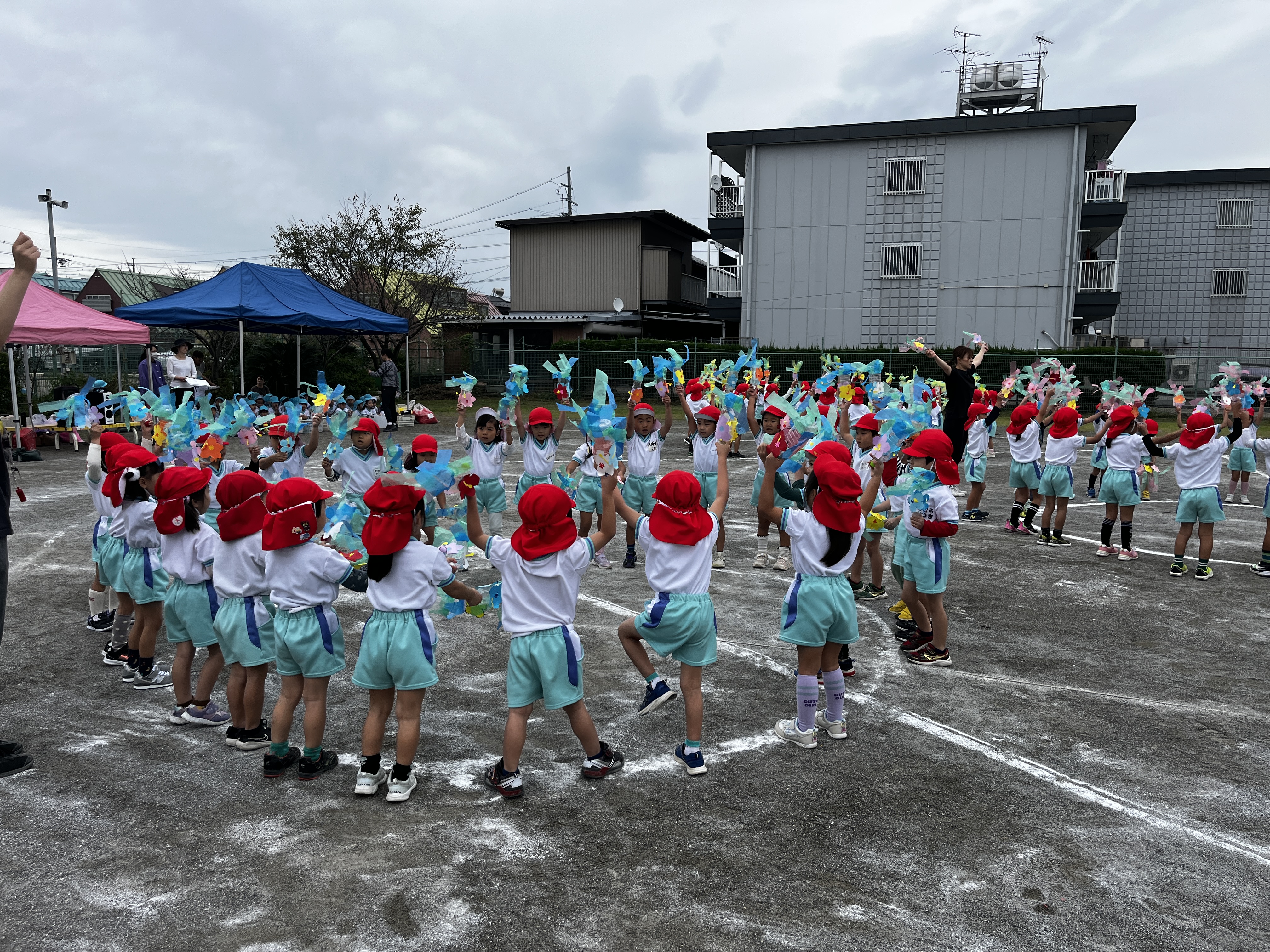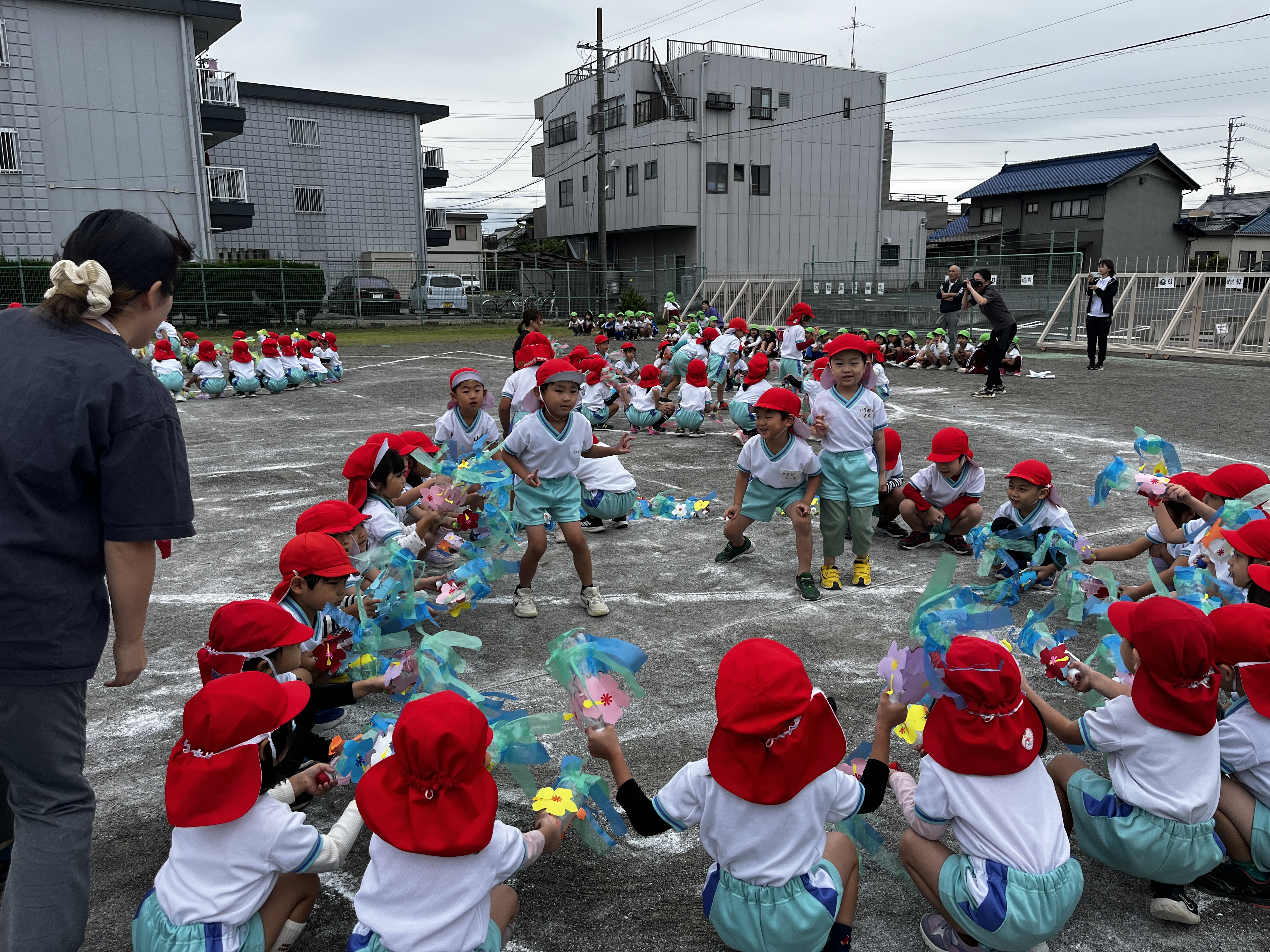 もも組が自分で製作した鯉のぼりを持って外で遊びました。